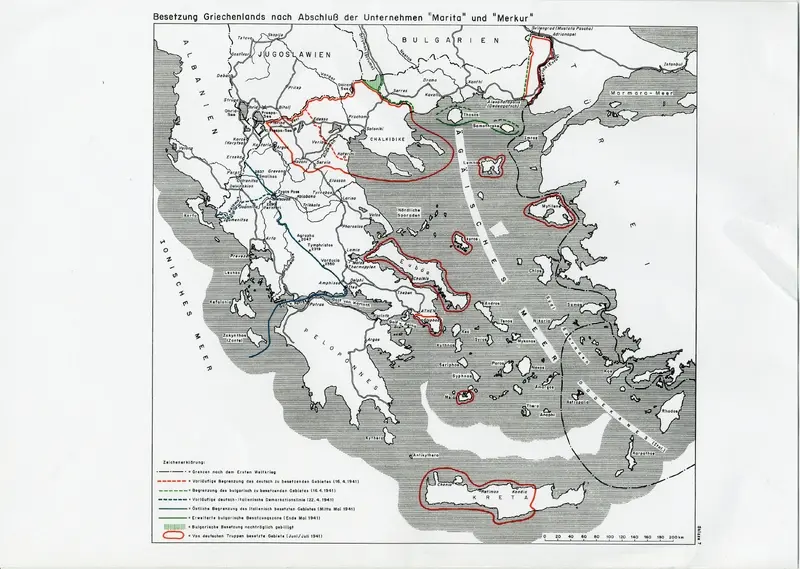 Η εικόνα απεικονίζει έναν ιστορικό γερμανικό χάρτη που απεικονίζει την κατοχή της Ελλάδας μετά την ολοκλήρωση της επιχείρησης Marita και της επιχείρησης Merkur το 1941. Απεικονίζει τη διαίρεση της ελληνικής επικράτειας μεταξύ γερμανικών, ιταλικών και βουλγαρικών δυνάμεων κατοχής.