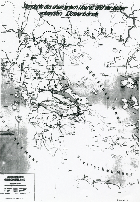 Αντίγραφο ενός γερμανικού στρατιωτικού χάρτη με την ένδειξη «Γενικός χάρτης της Ελλάδας - τοποθεσίες του πρώην ελληνικού στρατού και των μονάδων του ΕΛΑΣ», που επισημαίνει γεωγραφικές περιοχές στην Ελλάδα κατά τη διάρκεια μιας Κατοχής.