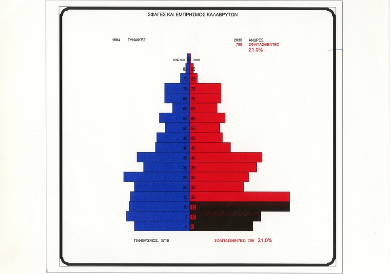 Στατιστικό διάγραμμα όπου επεικονίζεται ο πληθυσμός των γυναικών και των ανδρών ανα ηλικία στα Καλάβρυτα καθώς και ο αριθμός των εκτελεσθέντων ανα ηλικία.