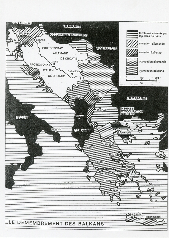 Η εικόνα απεικονίζει ένανγαλλικό χάρτη που απεικονίζει τον διαμερισμό των Βαλκανίων απο τις Ιταλικές, Γερμανικές, Βουλγαρικές και συμμαχικές δυνάμεις του Άξονα.