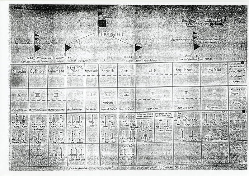 Η ιεραρχία Γερμανικών μονάδων στην κατεχόμενη Ελλάδα και συγκεκριμένα για την Festungs-Division (Τμήμα Φρουρίου), Seekommandant (Διοικητής Θάλασσας) και Küstenverteidigungs-Abschnitt (Τομέας Παράκτιας Άμυνας).