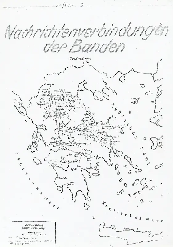 Αντίγραφο ενός γερμανικού στρατιωτικού χάρτη με την ένδειξη «"Οι επικοινωνιακοί δεσμοί των αντιστασιακών ομάδων"», που επισημαίνει γεωγραφικές περιοχές στην Ελλάδα κατά τη διάρκεια μιας Κατοχής και την δράση των Αντιστασιακών Ομάδων τον Ιούνιο του 1944.