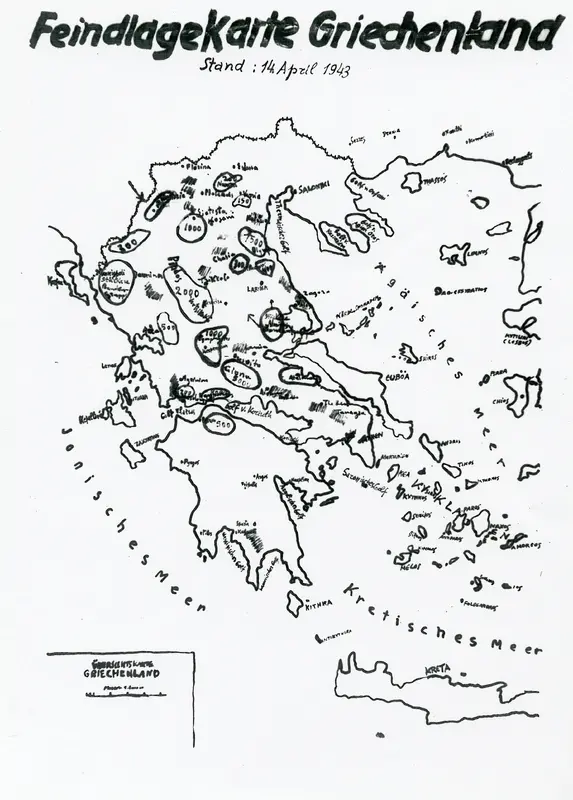 Αντίγραφο ενός γερμανικού στρατιωτικού χάρτη με την ένδειξη «Χάρτης κατάστασης εχθρού», που επισημαίνει γεωγραφικές περιοχές στην Ελλάδα κατά τη διάρκεια μιας Κατοχής και την δράση των Αντιστασιακών Ομάδων.