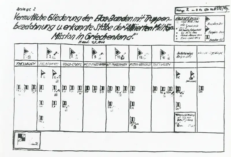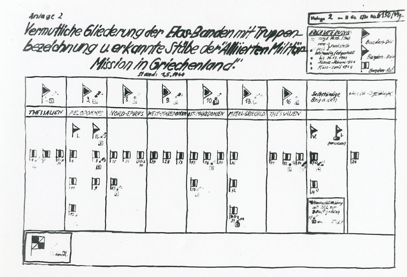 Αντίγραφο ενός γερμανικού στρατιωτικού σχεδιαγράμματος με την οργανωτική δομή του ΕΑΜ-ΕΛΑΣ ανά περιοχή τον Μάιο του 1944.